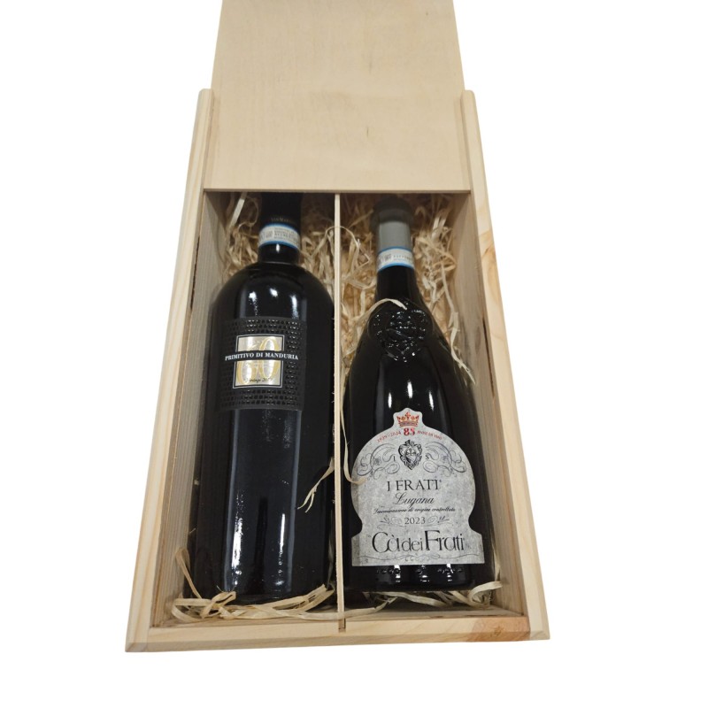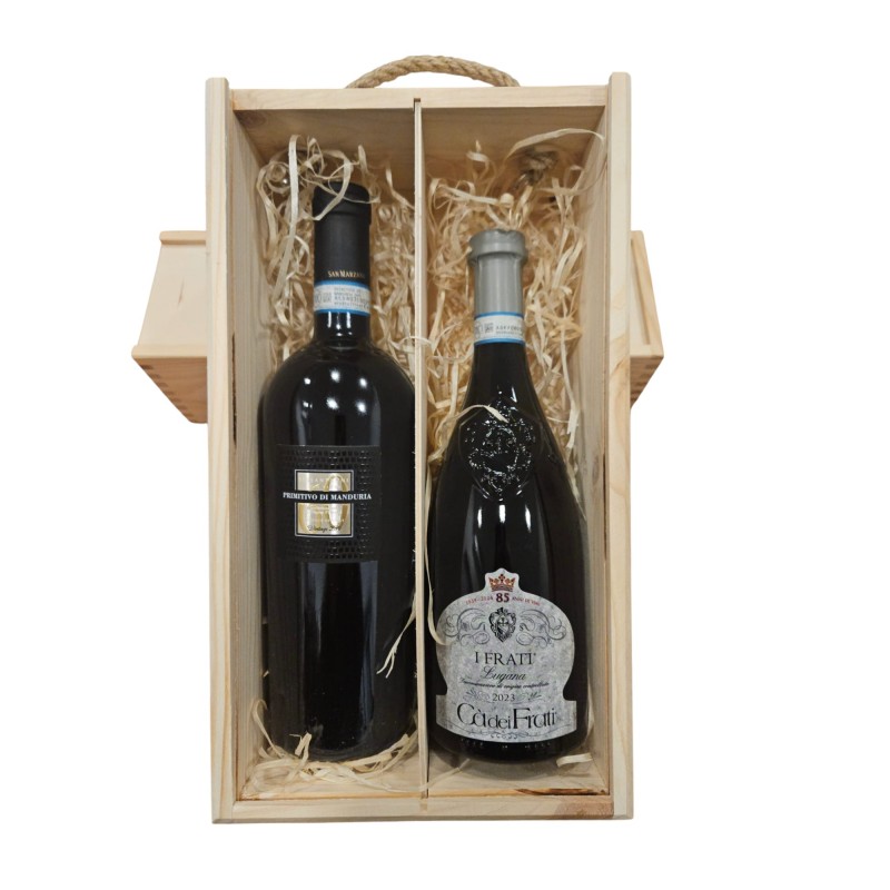 Zestaw prezentowy - 60 Sessantanni Primitivo di Manduria San Marzano + Ca Dei Frati Lugana 2022 + skrzynka drewniana